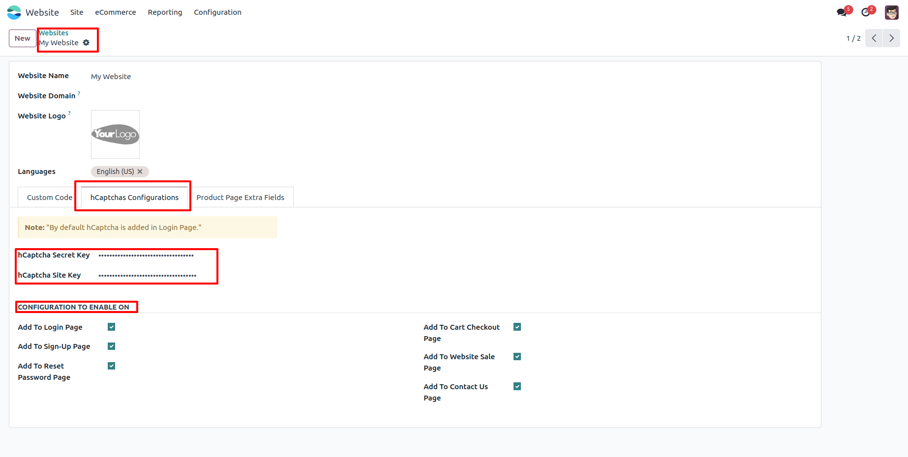 ◆ Further user need to open a website record and there user will a page hCaptcha Configurations.