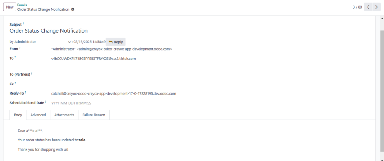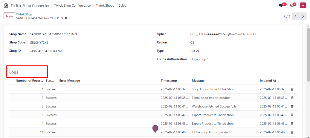Automatic logs are generated in Odoo to track all sync actions, ensuring transparency and monitoring of connector performance. These logs capture every update, including product syncs, inventory adjustments, order processing, refund handling, and webhook notifications, providing insights into successful operations and potential errors. With detailed tracking, users can troubleshoot issues efficiently, maintain an audit trail, and ensure seamless operations between Odoo and Tiktok Shop.
