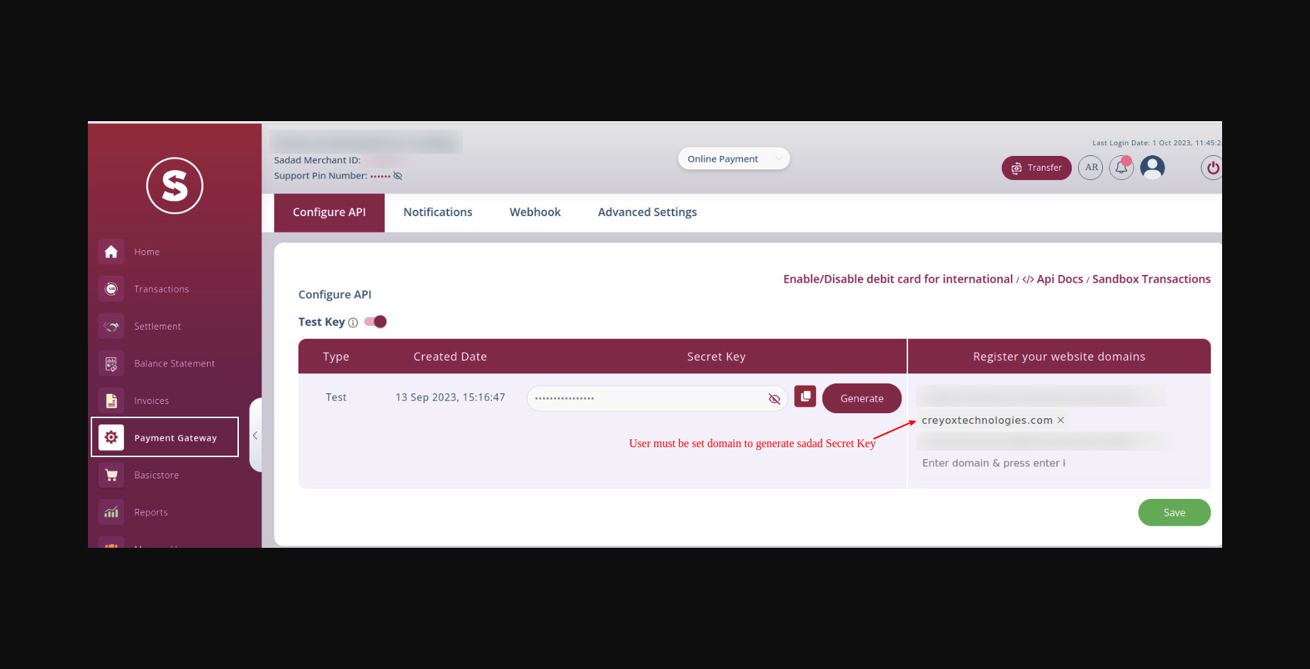 - User must be set domain within sadad panel.