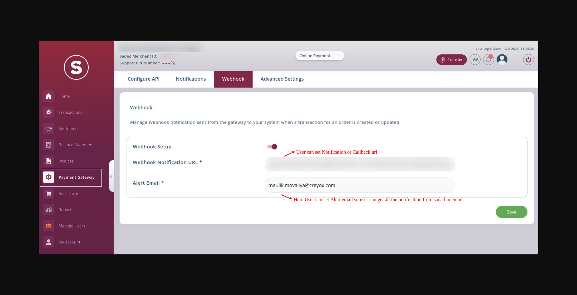 - User can set alert email to get email from the sadad.