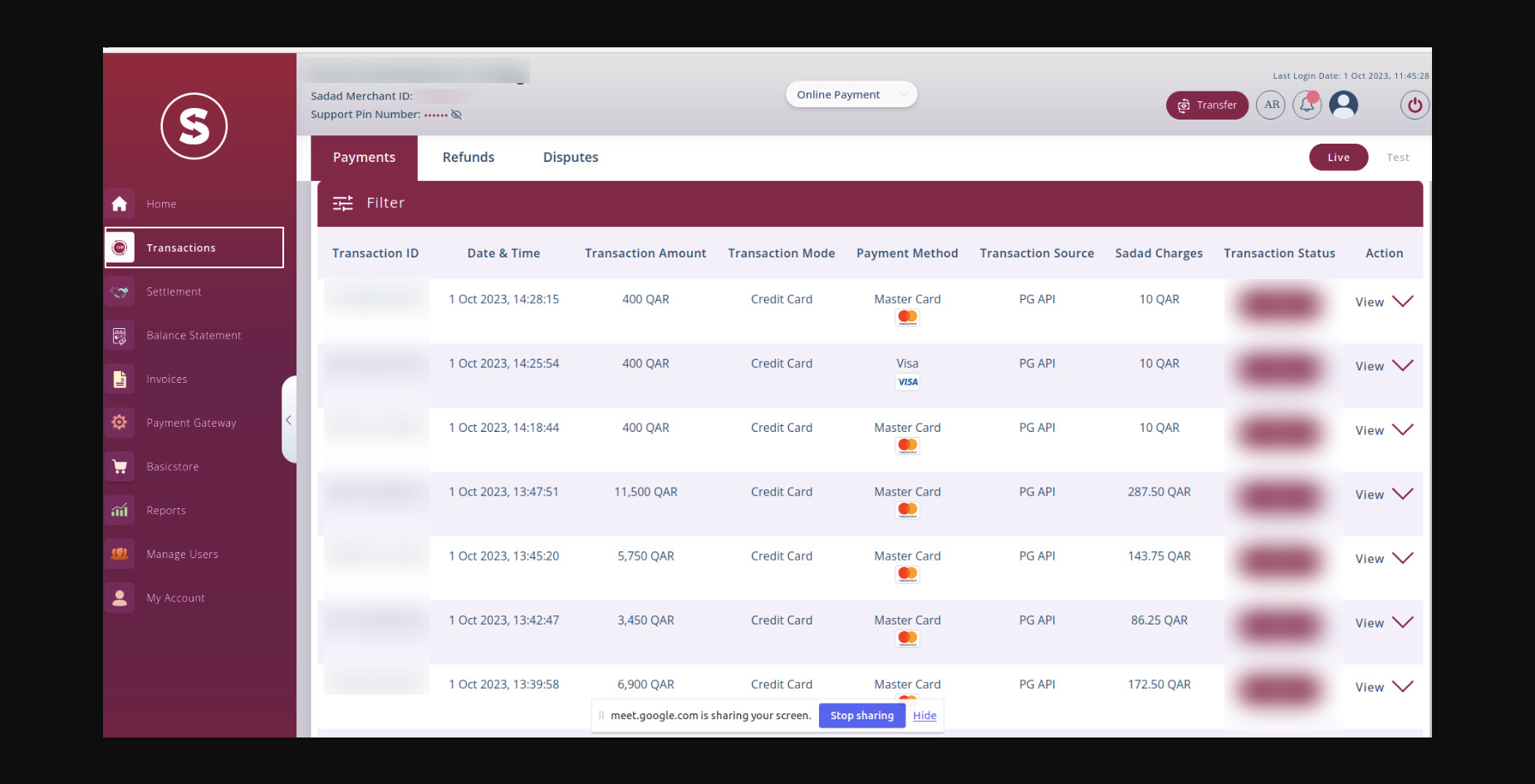 - User can see all payment transactions history in sadad panel.