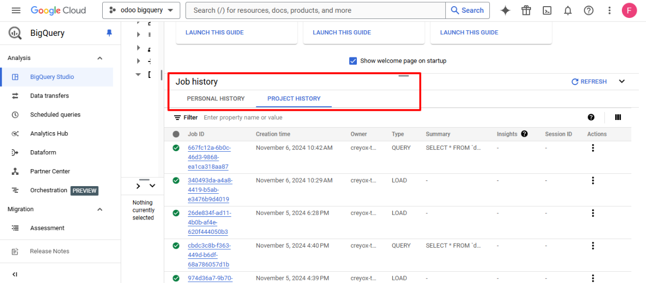 ◆ Transaction logs for syncing tables between Odoo and BigQuery are available in BigQuery as shown below.