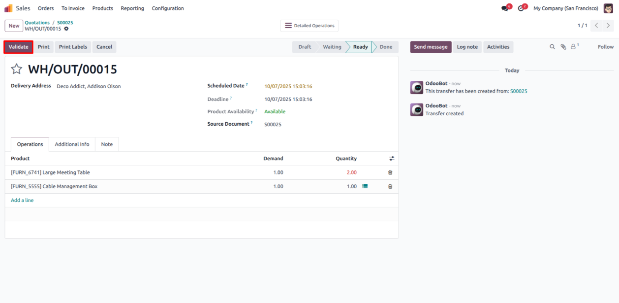 - After sales order confirmation, Now inside the Delivery Order click validate button.