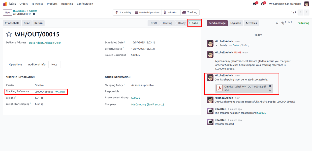 - Retrieve the Automatically generated Shipping label and Tracking number in the delivery order.