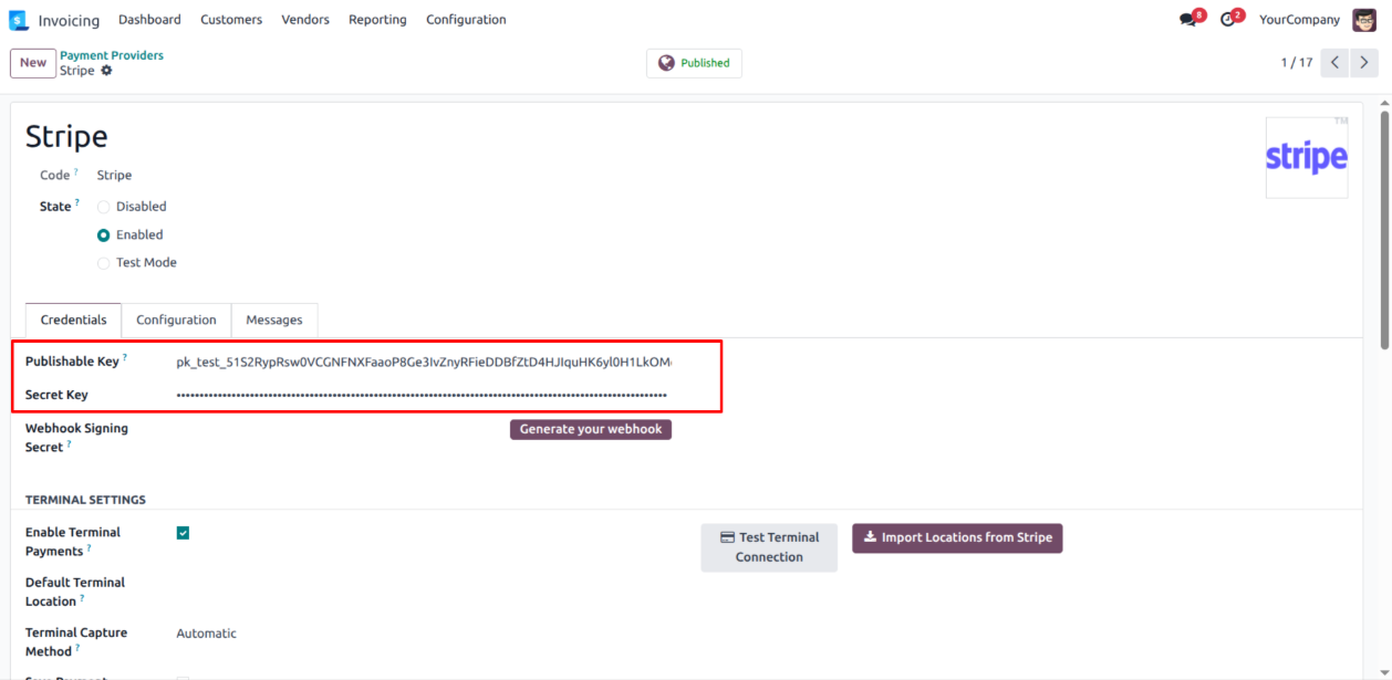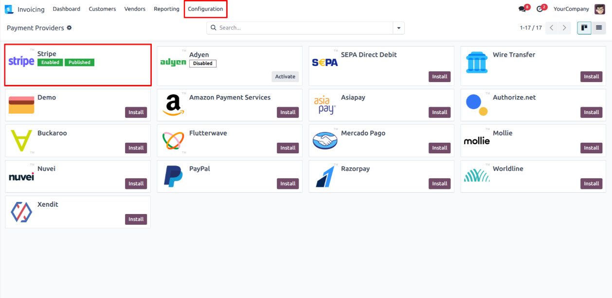 - Navigate to Accounting >> Configuration >> Payment Providers and enable the Stripe provider.