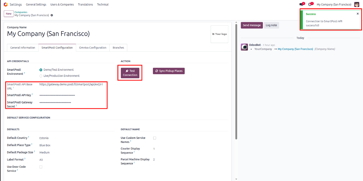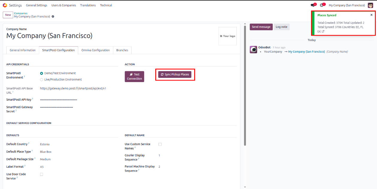 • By clicking on Sync Pickup Places button you will get the smartPosti places from smartPosti to odoo showing a success message notification.