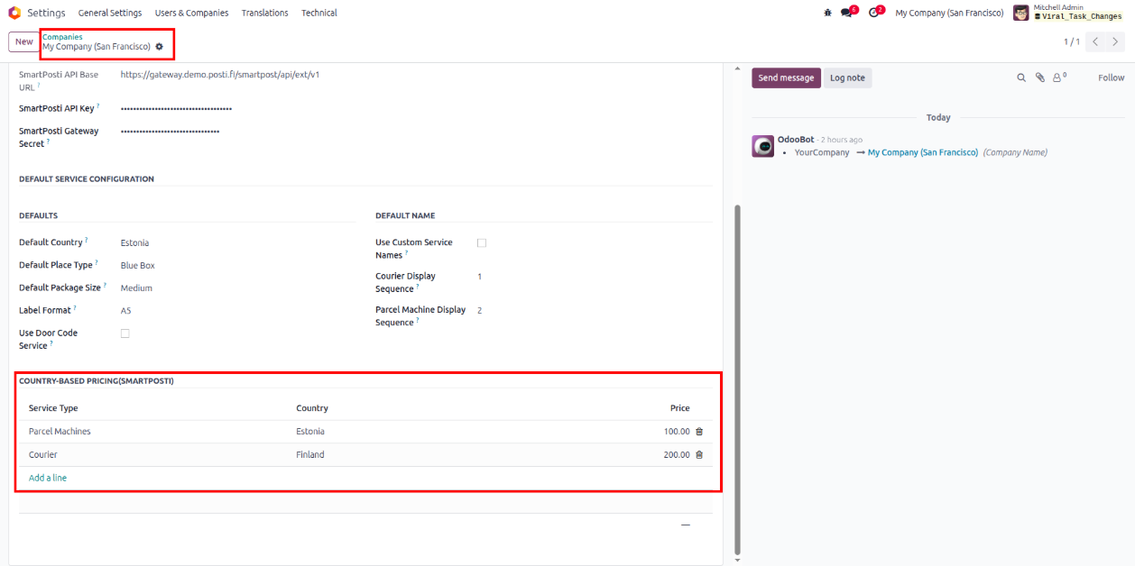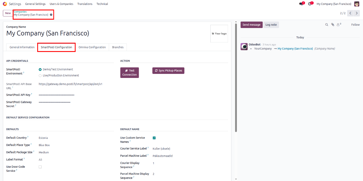 • Navigate to Settings >> Companies there user will find SmartPosti Configuration & Omniva Configuration.