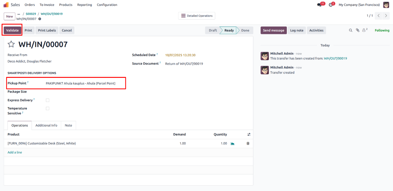 • After sales order confirmation, Now inside the Delivery Order select the Pickup Point and click Validate button.
