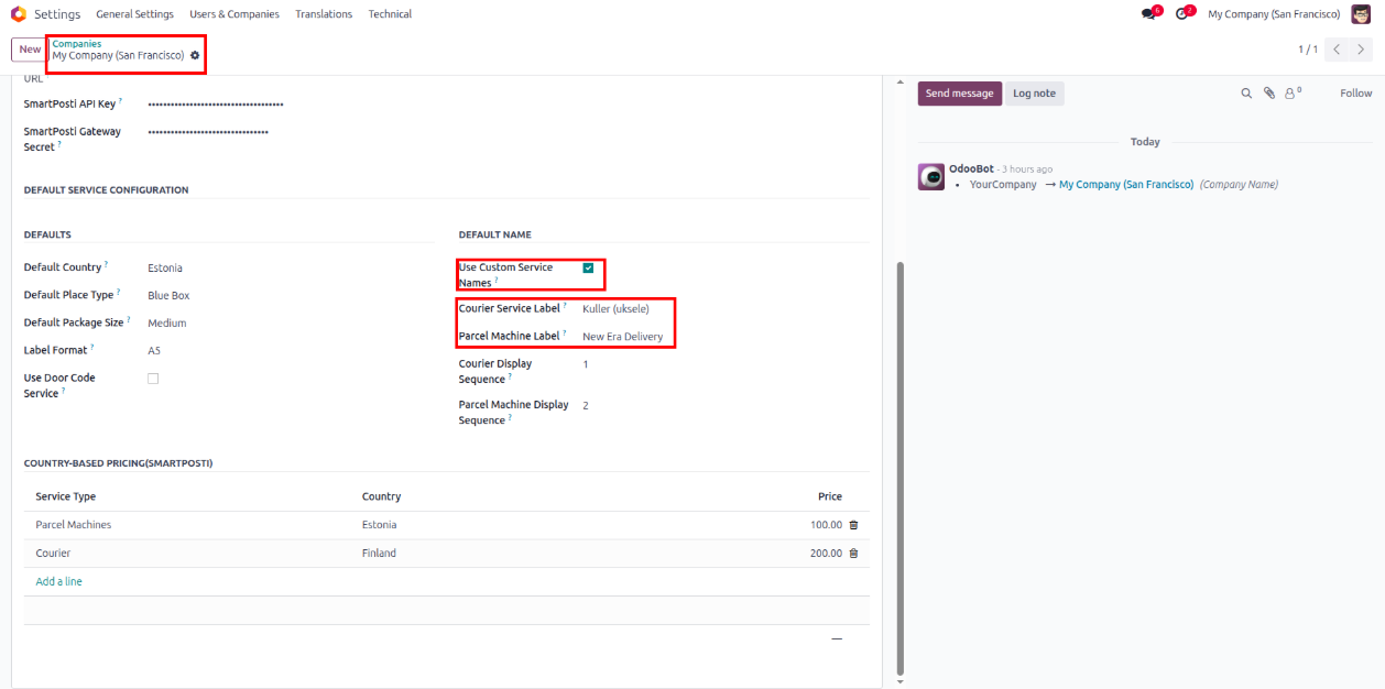 • Also, user will see fields Courier Service Label & Parcel Machine Label when enabled Use Custom Service Names under Default Name section of company page SmartPosti Configuration.