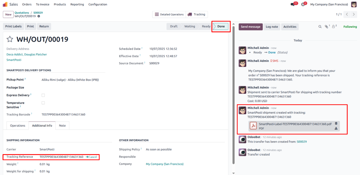 • Retrieve the Automatically generated Shipping Label and Tracking number in the delivery order.